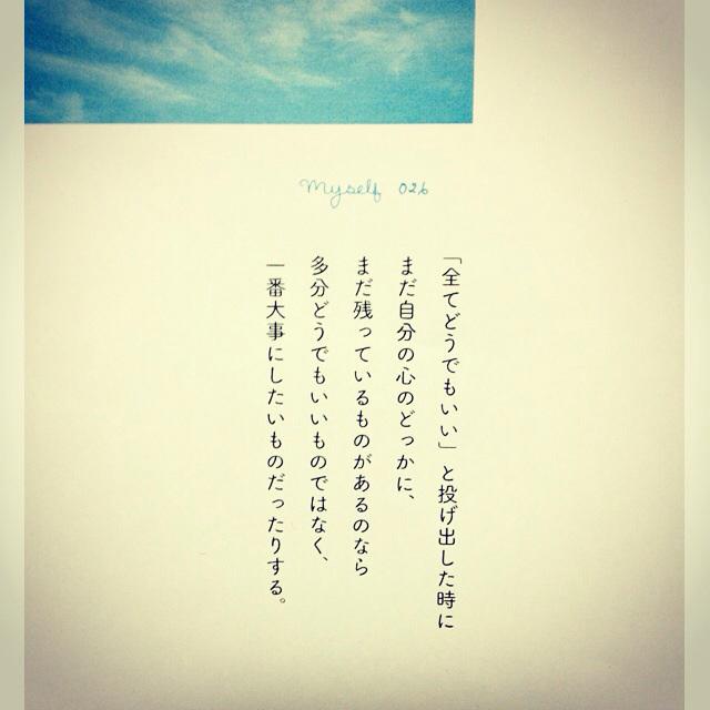 カフカ Auf Twitter だから そばにいて Myself 026 全てどうでもいい と投げ出した時にまだ自分の心のどっかに まだ残っているものがあるのなら多分どうでもいいものではなく 一番大事にしたいものだったりする Http T Co Boo427ybek